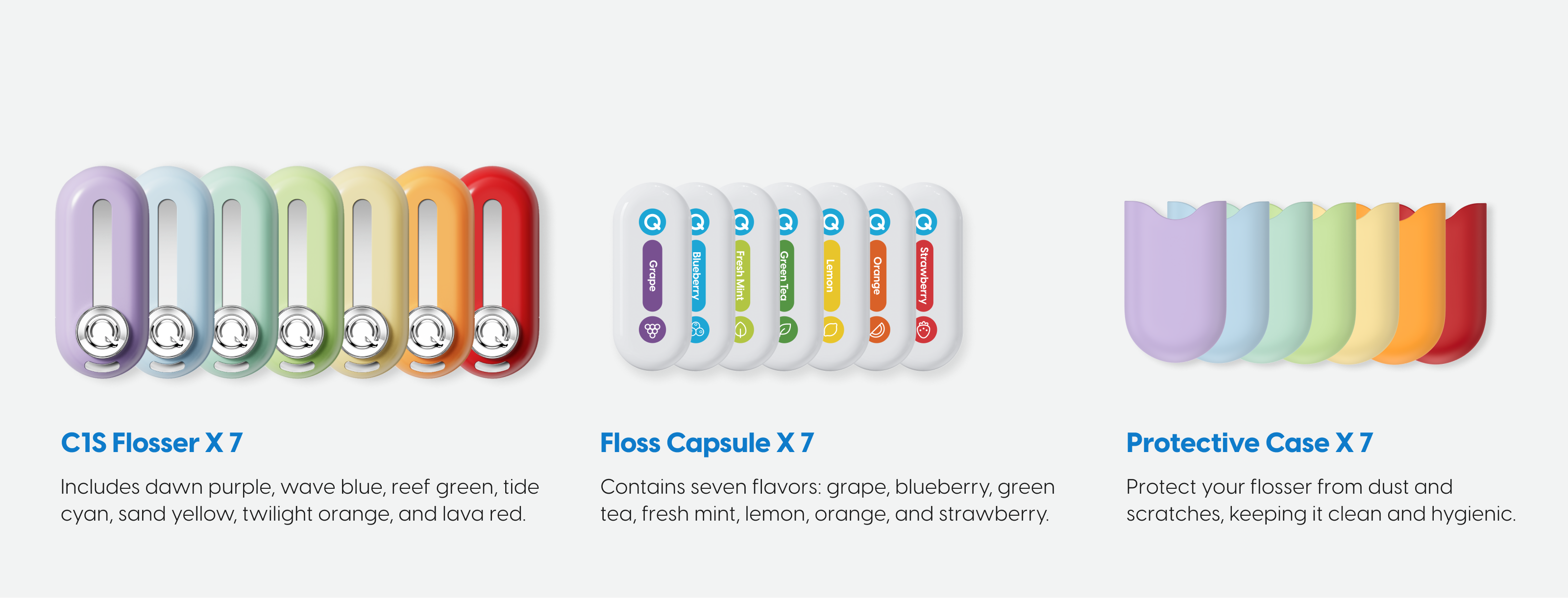 The QicoBay UpFlosser C1S Rainbow Collection includes seven vibrant colors: dawn purple, wave blue, reef green, tide cyan, sand yellow, twilight orange, and lava red, designed to match any outfit and mood. Paired with seven carefully crafted natural flavors—grape, blueberry, fresh mint, green tea, lemon, orange, and strawberry—these flossers offer a delightful flossing experience. Stylishly crafted and eco-friendly, they make an excellent choice not only for personal or family use but also as thoughtful gifts.
